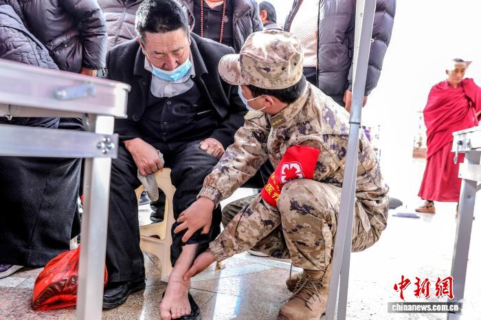 圖為軍醫(yī)為民眾檢查腿腳疼痛問題。彭毅 供圖
