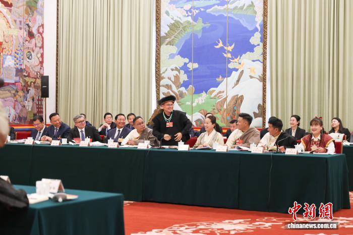 3月6日,全國(guó)人大代表扎西江村(中間起立者)身著珞巴族服飾,出席十四屆全國(guó)人大四次會(huì)議西藏代表團(tuán)開(kāi)放團(tuán)組會(huì)議。中新社記者 楊郁然 攝