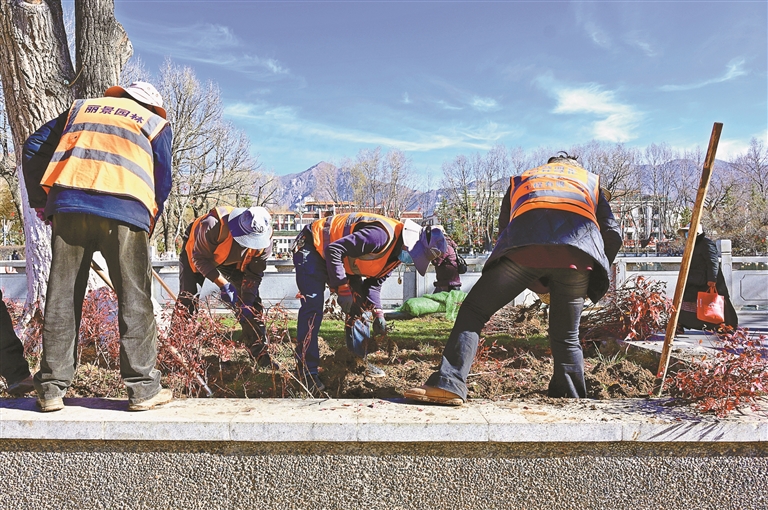 陽(yáng)春三月,雪域高原春意漸濃。在拉薩市區(qū)的一處公園綠地內(nèi),園林工人們正搶抓春季綠化黃金期,開(kāi)展苗木栽植作業(yè)。圖為工人在栽植苗木。記者 唐斌 攝