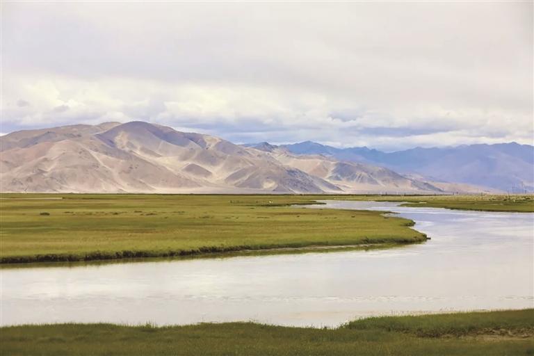 遠處的雪山,山峰終年積雪,陽光在山丘上投下斑駁的光影;河水在此變得溫柔,千回百轉,繞過石塊,穿過草甸;水中嬉戲的水鳥翩躚起舞,狂奔的藏野驢自由歡騰;草地上牛羊悠閑吃草,牧民的帳篷升起裊裊炊煙。