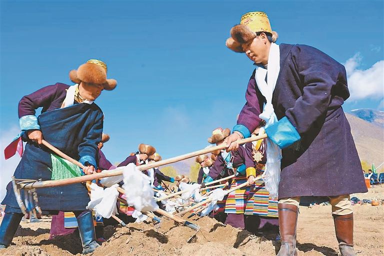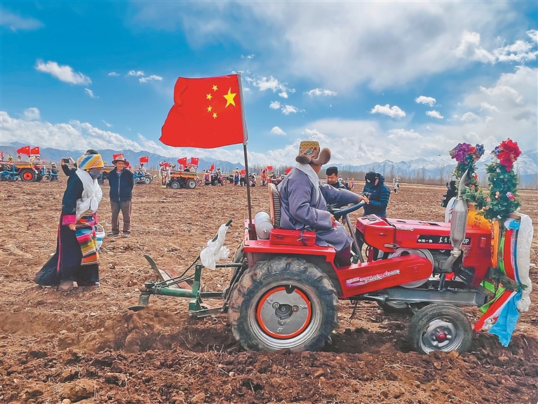 開耕儀式上,村民身著節(jié)日盛裝,聚在田間地頭,拖拉機(jī)等農(nóng)機(jī)設(shè)備擦拭一新,機(jī)頭鮮艷的五星紅旗迎風(fēng)招展。大家捧出切瑪盒,一字排開,互獻(xiàn)哈達(dá)、互敬青稞酒、同唱祝福歌,每個人臉上都洋溢著對豐收年景的期盼。
