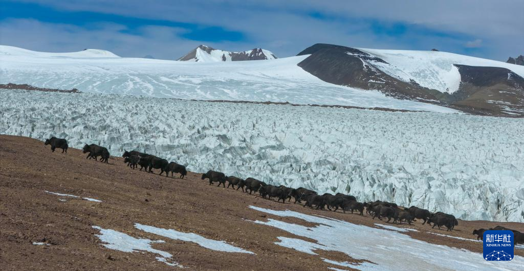 野牦牛群從藏色崗日冰川旁走過(無人機(jī)照片,3月10日攝)。新華社發(fā)(四郎江村攝)