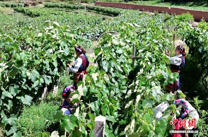 2025年夏天,工人們?cè)谖鞑孛⒖悼h一葡萄園里進(jìn)行夏季管理。(受訪者供圖)