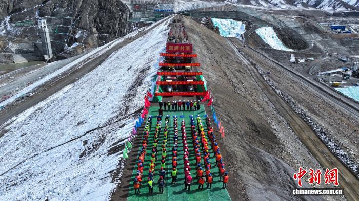 西藏帕孜水利樞紐工程主壩封頂現(xiàn)場。中國水電基礎(chǔ)局有限公司供圖
