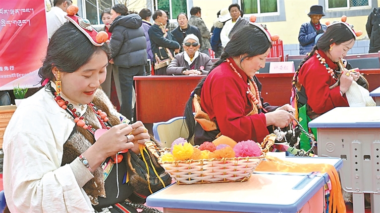 洛隆縣孜托鎮(zhèn)藏族婦女參加手工編織技藝比賽。