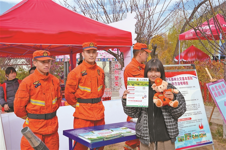 林芝消防救援機(jī)動(dòng)支隊(duì)巴宜大隊(duì)指戰(zhàn)員向群眾普及防火知識。通訊員 丹增平措 攝