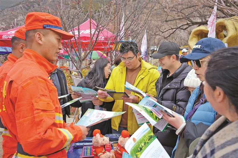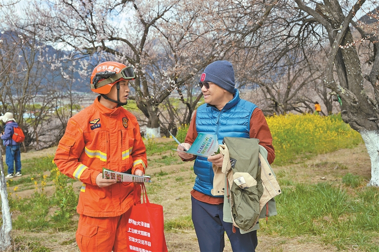 春和景明,桃花漸次綻放,各地游客紛至沓來,景區(qū)用火風(fēng)險(xiǎn)也同步攀升。為了切實(shí)筑牢防火安全防線,近日,林芝消防救援機(jī)動(dòng)支隊(duì)巴宜大隊(duì)深入巴宜區(qū)林芝鎮(zhèn)嘎拉村,在游客集散點(diǎn)、桃花林核心區(qū)域設(shè)立定點(diǎn)防火宣傳點(diǎn),通過漢藏雙語展板、宣傳手冊和現(xiàn)場講解,向游客普及森林防火知識與應(yīng)急避險(xiǎn)技能。同時(shí),組建流動(dòng)宣傳小隊(duì),利用廣播宣講、沿街提醒等方式,將消防安全知識延伸至游客步道、商戶,確保宣傳無死角、全覆蓋。此外,執(zhí)勤人員攜帶風(fēng)力滅火機(jī)、組合工具等專業(yè)裝備,沿著陡峭的步道和林區(qū)小徑展開拉網(wǎng)式巡查,確保遇有突發(fā)情況能夠快速響應(yīng)、高效處置。