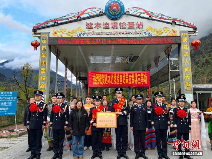 圖為林芝邊境管理支隊(duì)送獎(jiǎng)小組為達(dá)木邊境檢查站集體三等功頒發(fā)證書?!×种ミ吘彻芾碇ш?duì)供圖