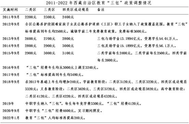 黨的十八大以來(lái),“三包(包吃、包住、包學(xué)費(fèi))”人均標(biāo)準(zhǔn)不斷大幅提升。2012年起,西藏全面落實(shí)15年公費(fèi)教育“三包”政策。同年底,西藏“三包”年總經(jīng)費(fèi)由2008年的3.61億元增加到12.29億元,年均增幅達(dá)36%,受惠學(xué)生增加到51萬(wàn)人。 到2014年,西藏“三包”經(jīng)費(fèi)增加到15.19億元,全區(qū)有52.5萬(wàn)名學(xué)生受益,覆蓋面100%,實(shí)現(xiàn)了由“選擇性保障”到“覆蓋式保障”。 中央第六次西藏工作座談會(huì)后,投入力度更大。1985-2015年30年間,西藏“三包”經(jīng)費(fèi)累計(jì)投入逾80億元, 而到2020年35年投入超200億元。僅2016-2020年,西藏教育“三包”資金投入達(dá)104.74億元,年均增幅11.4%。 從1985年到2020年的35年間,西藏教育“三包”政策累計(jì)調(diào)整20次,2011-2020年的10年間,就調(diào)整了10次。2022年1月,“三包”人均標(biāo)準(zhǔn)再次提高。在比如縣,2021年底全縣享受“三包”及助學(xué)金的學(xué)生達(dá)到17771人, 占比如縣總?cè)丝诘?4.5%。