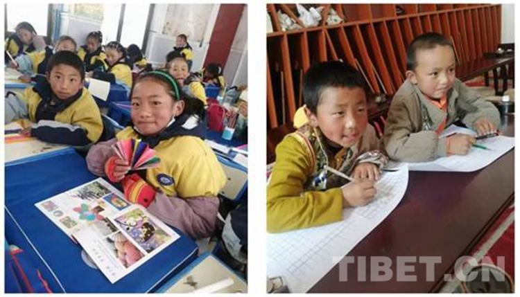 圖為西藏自治區(qū)那曲市比如縣羊秀鄉(xiāng)小學(xué)的孩子們?cè)谏鲜止ふn(左)和書法課(右) 攝影:米瑪旺久