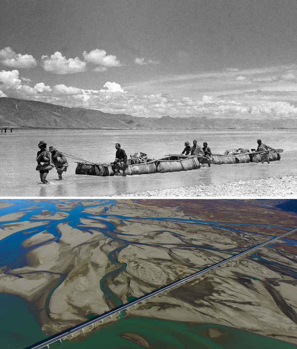 ↑拼版照片:上圖是20世紀(jì)50年代,雅魯藏布江上游的牛皮船載著土特產(chǎn)和糧食沿江運(yùn)輸至西藏東部(新華社發(fā)趙奇攝);下圖是2016年12月11日拍攝的位于西藏山南市扎囊縣境內(nèi)的扎囊特大橋(新華社記者 普布扎西 攝)。