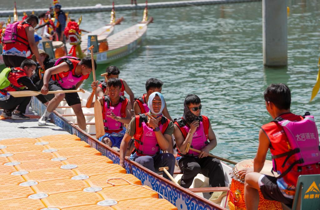↑5月31日,在拉薩市濱河公園旁的水域內(nèi),選手們正在準(zhǔn)備出發(fā)。新華社記者 晉美多吉 攝