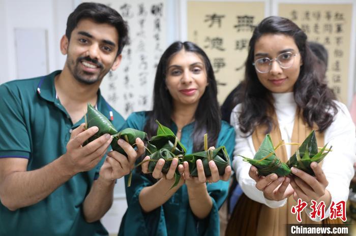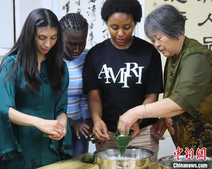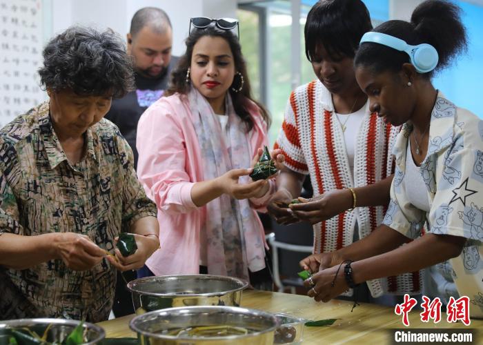 5月27日,在河北省秦皇島市海港區(qū)白塔嶺街道燕大西苑社區(qū),當(dāng)?shù)赝鈬魧W(xué)生相聚一堂,通過包粽子、體驗?zāi)景婺戤嫷确绞?,沉浸式體驗中華文化的魅力。