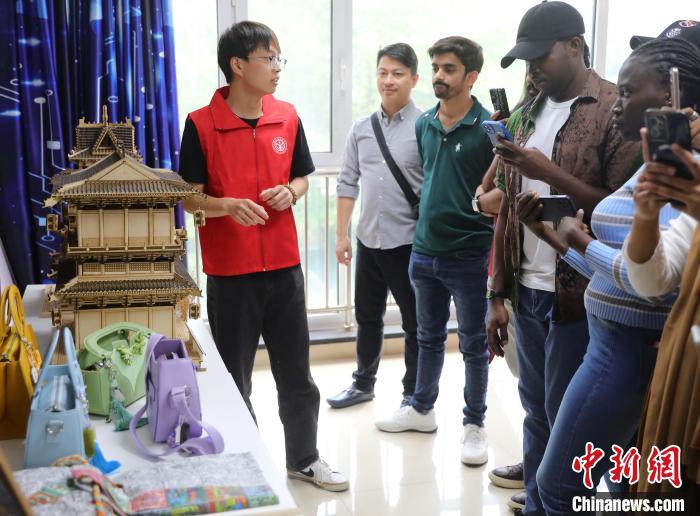 圖為志愿者帶領(lǐng)外國留學(xué)生參觀工藝品。曹建雄 攝