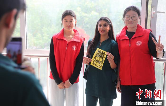圖為外國留學(xué)生持作品與志愿者合影留念。曹建雄 攝