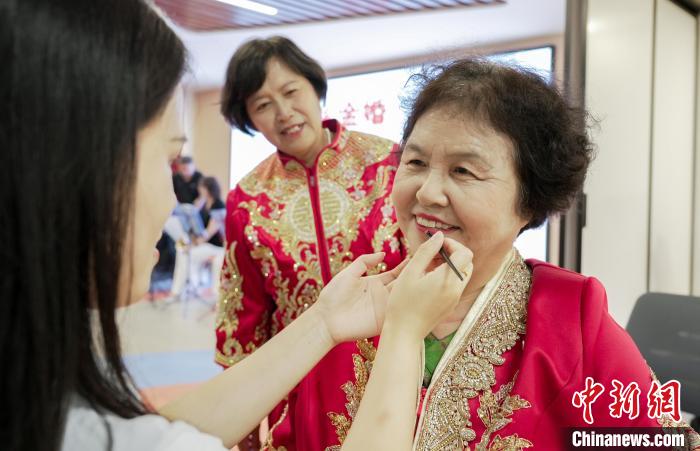 七夕將至,河北省邯鄲市老人走進叢臺區(qū)光明橋街道天璽苑社區(qū),參加“七夕迎金婚 共創(chuàng)好家風(fēng)”慶典,回憶半個世紀的愛情。金婚慶典儀式經(jīng)過牽手入場、夫妻對拜、執(zhí)子之手、回憶往昔等環(huán)節(jié),見證了金婚夫妻們相濡以沫、互敬互愛的美滿婚姻。金婚老人結(jié)合親身經(jīng)歷,分享家風(fēng)家訓(xùn)及愛情故事,講述家庭幸福的秘訣,“曬”出婚姻保鮮的秘籍,分享婚姻的經(jīng)營智慧。圖為8月6日,老人正在化妝。王倩倩 攝