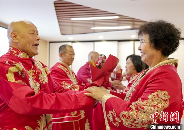 七夕將至,河北省邯鄲市老人走進叢臺區(qū)光明橋街道天璽苑社區(qū),參加“七夕迎金婚 共創(chuàng)好家風(fēng)”慶典,回憶半個世紀的愛情。金婚慶典儀式經(jīng)過牽手入場、夫妻對拜、執(zhí)子之手、回憶往昔等環(huán)節(jié),見證了金婚夫妻們相濡以沫、互敬互愛的美滿婚姻。金婚老人結(jié)合親身經(jīng)歷,分享家風(fēng)家訓(xùn)及愛情故事,講述家庭幸福的秘訣,“曬”出婚姻保鮮的秘籍,分享婚姻的經(jīng)營智慧。圖為8月6日,丈夫為老伴兒獻鮮花。王倩倩 攝