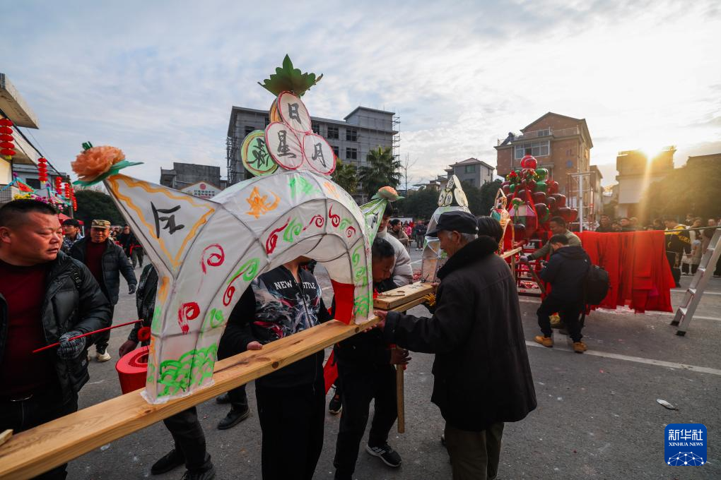 2月10日,赤松鎮(zhèn)虎巖村村民將板凳龍連接起來,準備進行晚上的巡游。