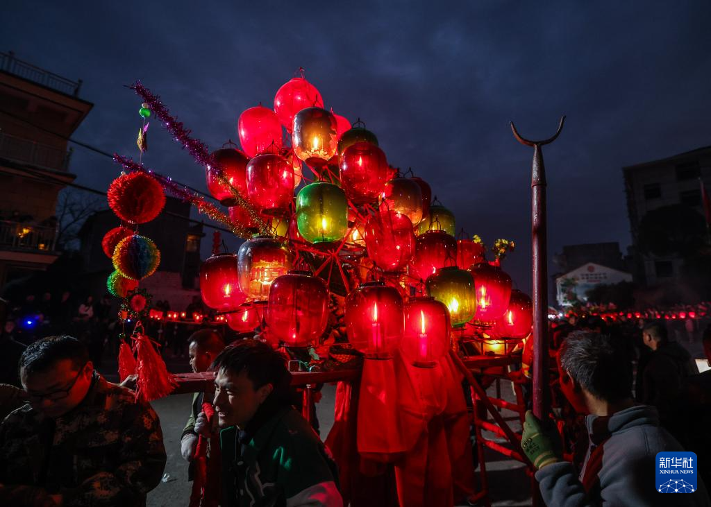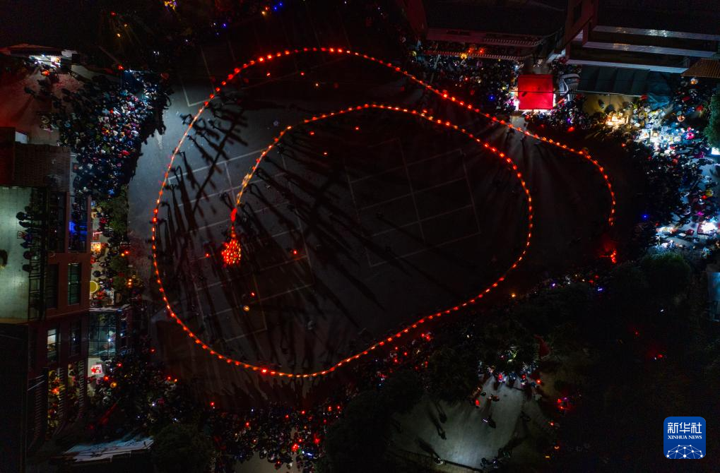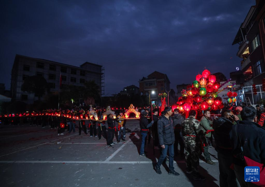 當日是農歷正月十三,浙江省金華市金東區(qū)赤松鎮(zhèn)虎巖村村民肩扛由100余節(jié)板凳組成的傳統(tǒng)五彩龍燈,沿村道蜿蜒游舞。板凳龍的龍頭被彩燈包裹,裝飾有花卉、祥云等圖案,在燭光搖曳間營造出“龍騰盛世”的年俗畫卷。每年元宵節(jié)前后,浙江省金華市金東區(qū)赤松鎮(zhèn)的各村村民都會舞起板凳龍燈,祈求來年風調雨順、五谷豐登。