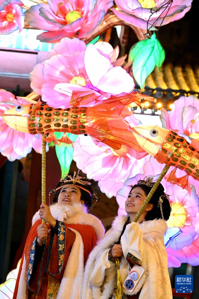 2月8日晚,身著傳統(tǒng)服飾的游人在河北省石家莊市正定榮國府影視基地內游園賞花燈。