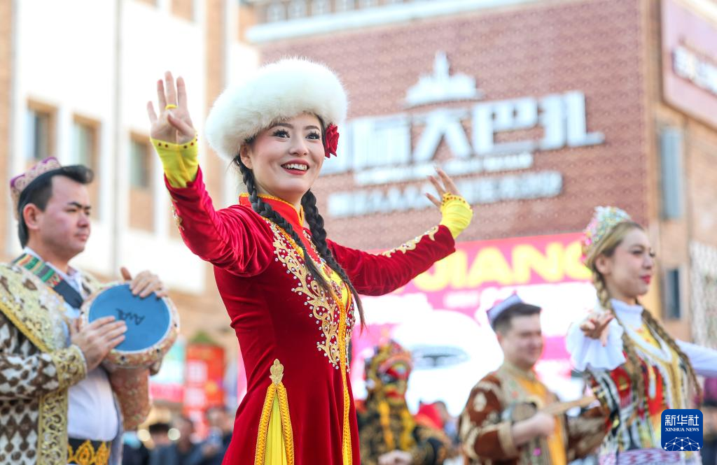 2月11日,演員在烏魯木齊大巴扎步行街舉辦的社火巡游活動中表演。