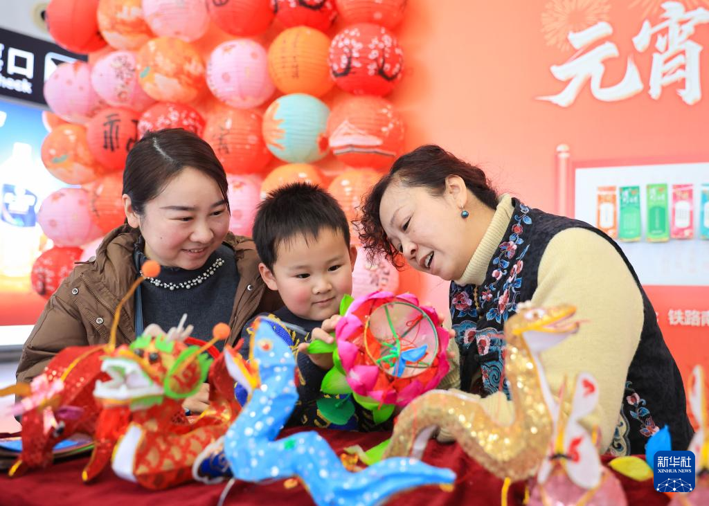 2月11日,旅客在南京南站舉辦的迎接元宵節(jié)活動上體驗制作花燈。