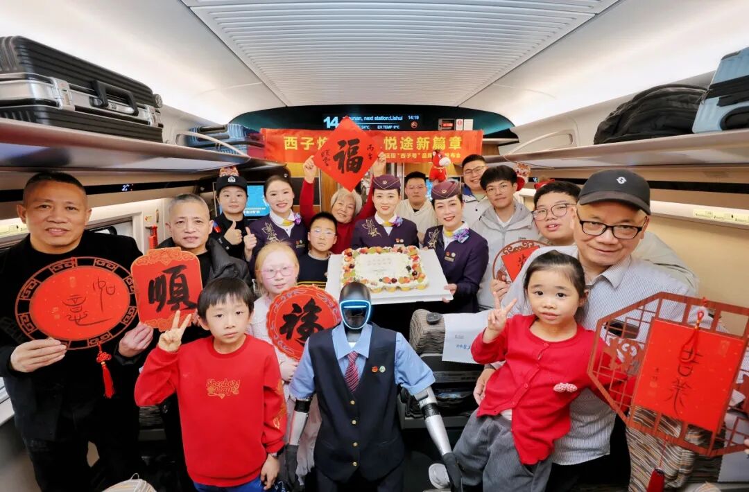 旅客在G41次列車(chē)上與機(jī)器人及乘務(wù)員合影。