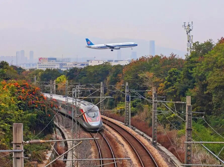 廈門(mén)島內(nèi)鷹廈線(xiàn)路上,紅色復(fù)興號(hào)與藍(lán)色飛機(jī)同框。
