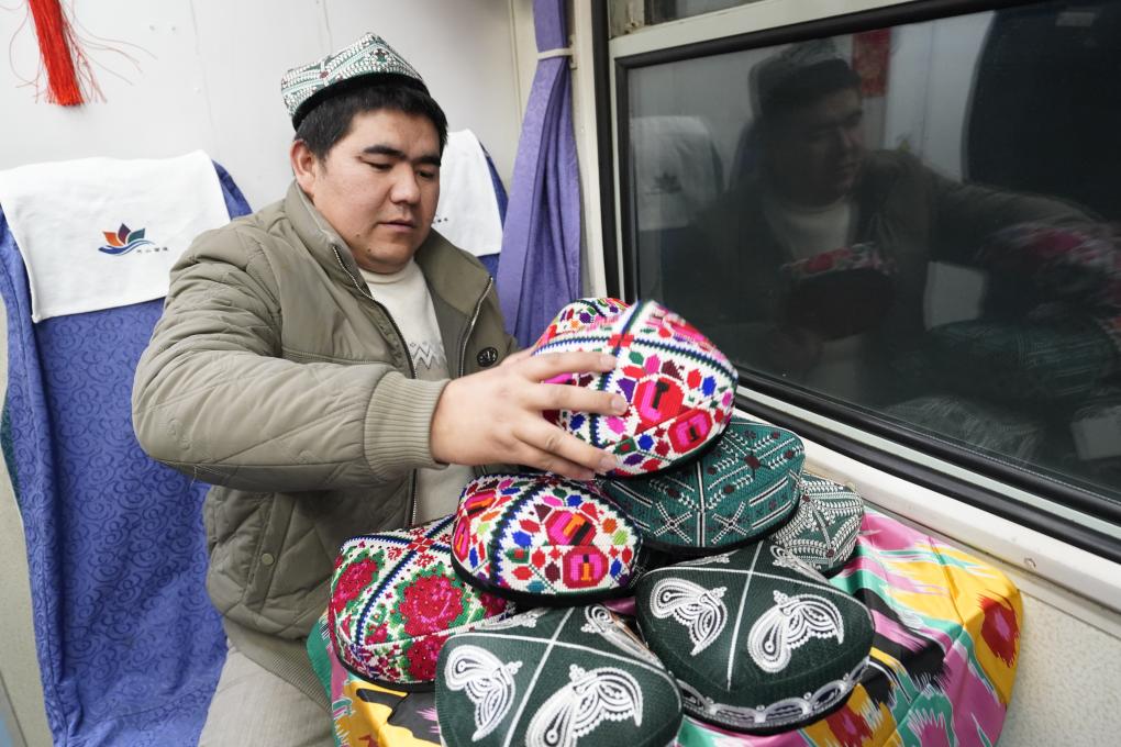 他的鄰座,喀什市商戶艾麥提·阿卜杜熱依木將一頂頂花帽在小桌上細(xì)心排開。石榴花、巴旦木紋在艷麗的底色上綻放,針腳細(xì)密如繡。“很多在南疆工作生活的朋友,過年要回老家,”艾麥提一邊整理一邊說,“挑選一頂花帽回家,是份地道的新疆心意?!?/p>