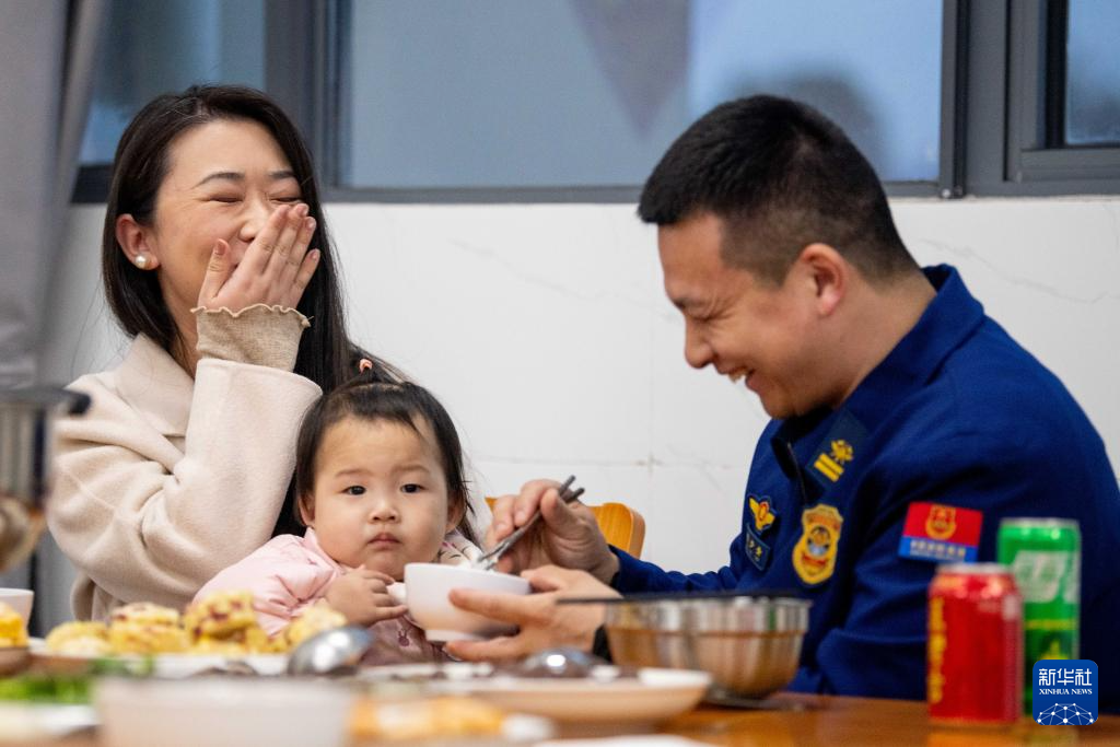 2月16日,在江蘇省泰興市澄江西路消防救援站,消防員和家屬一起吃團(tuán)圓飯。新華社發(fā)(楊玉崗攝)