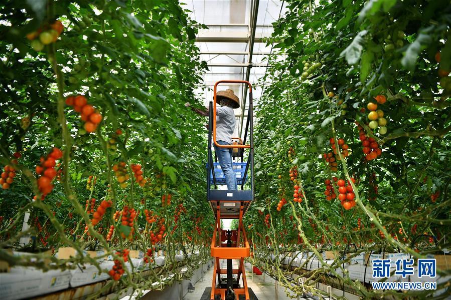 在陵水現(xiàn)代農(nóng)業(yè)示范基地,工人在管理通過擱架吊蔓式栽培技術(shù)種植的詹妮瑞番茄(3月26日攝)。在海南省陵水現(xiàn)代農(nóng)業(yè)示范基地,無土栽培技術(shù)、計(jì)算機(jī)自動化控制系統(tǒng)、立體垂直旋轉(zhuǎn)栽培、有機(jī)循環(huán)利用等多種科技元素聚集在一起。農(nóng)業(yè)工廠化的運(yùn)作模式,讓大棚里的瓜菜產(chǎn)量較傳統(tǒng)種植翻了幾番,農(nóng)民收入也大幅提高。新華社記者 郭程 攝