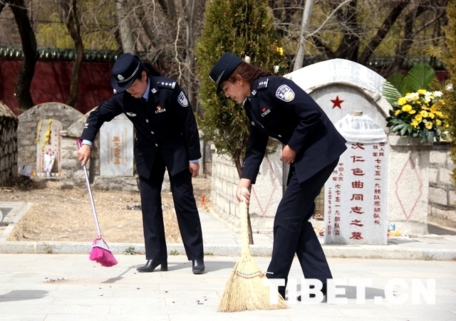 圖為西藏公安邊防總隊(duì)官兵祭掃烈士墓。