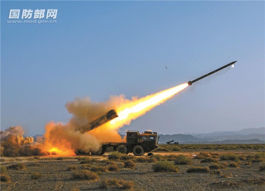“5、4、3、2、1,發(fā)射!”7時整,伴隨指揮員的發(fā)射命令,數(shù)十枚火箭彈似一顆顆流星在戈壁上空劃過,飛向“敵”陣……實時畫面顯示,所有炮彈準確覆蓋目標,“敵”陣遭到重創(chuàng)。