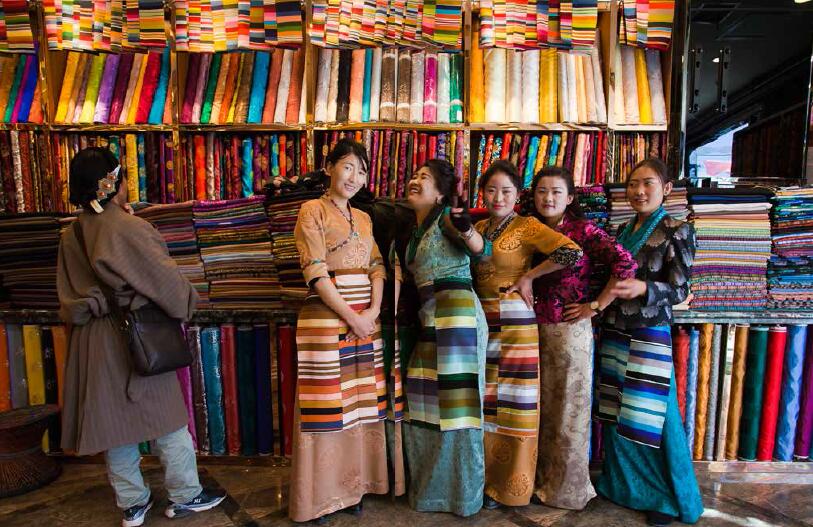 北京中路上,藏裝店里的年輕姑娘們穿著自家店里的藏裝,更顯出獨特的時尚與個性氣質。