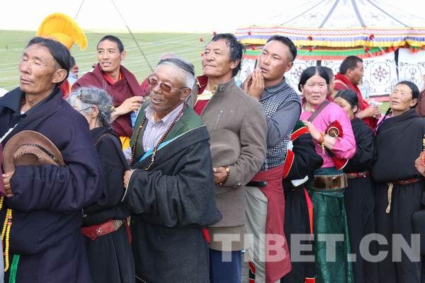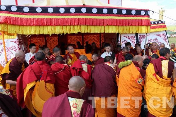 7月19日,班禪在玉樹州雜多縣貢薩寺舉行完法事后,中午就來到寺前的扎西灘,為信教群眾摸頂賜福。原計劃,信教群眾前來接受班禪大師的講經(jīng)灌頂和摸頂應于下午6點結束。但實際上在進行完長壽經(jīng)祈愿灌頂后,已下午3點半,為了能讓所有的信教群眾都受到祝福,在班禪的堅持下,為將近2萬信教群眾一個一個摸頂?shù)搅送砩?點多,加上灌頂法會,整個活動持續(xù)了整整8個多小時。班禪在灌頂法會和摸頂儀式中,不斷說的一句話就是:“我已經(jīng)祈愿祝福了你們!我已經(jīng)祈愿祝福了你!愿幸福和安康生生世世伴隨?!?/p>
