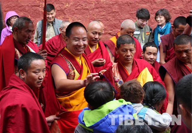 班禪朝拜完強(qiáng)巴佛殿出來后,看到恭候在外的人們,不辭辛勞,面帶微笑,一一為信教群眾和游客們摸頂賜福。攝影:王淑。