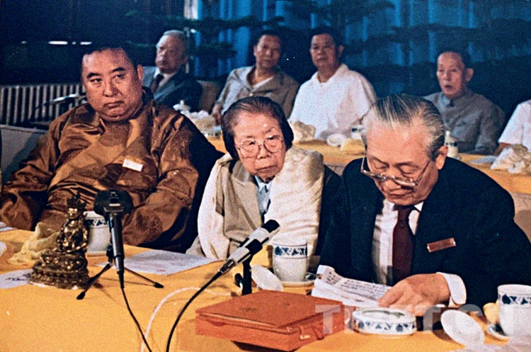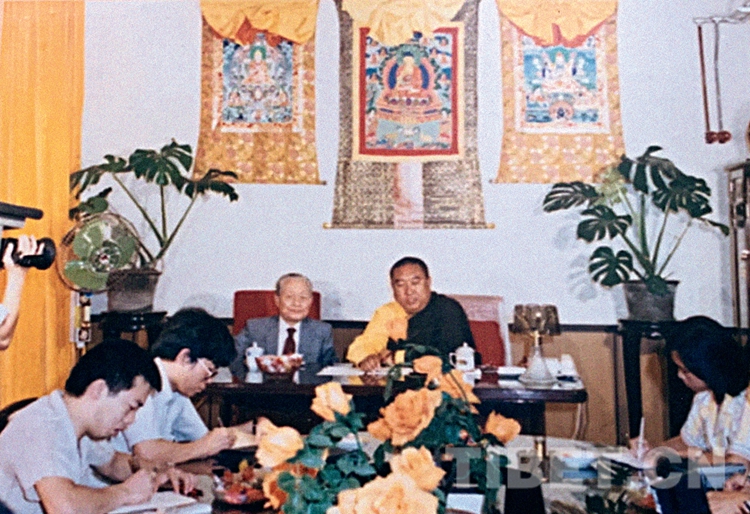 十世班禪和趙樸初顧問在中國藏語系高級(jí)佛學(xué)院成立儀式新聞發(fā)布會(huì)上接受媒體采訪。中國藏語系高級(jí)佛學(xué)院提供