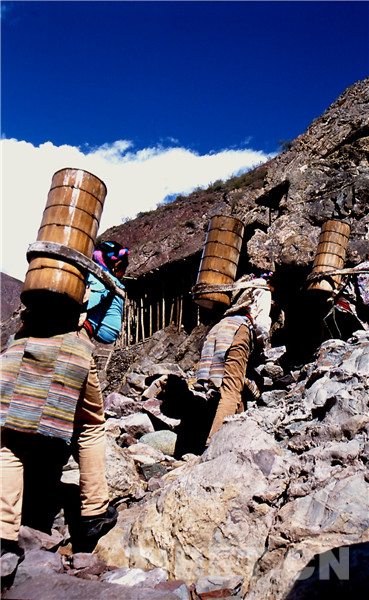 鹽田里的事自古就是由女人操持的,按她們的解釋是因為男人粗心,會弄臟了白花花的鹽,賣不出好價去。所以男人就負(fù)責(zé)運輸和銷售工作,他們會在女人已經(jīng)曬出小山樣的一堆鹽巴時,趕著騾馬來把鹽馱走,然后跋山涉水到巴塘、德欽、昌都一帶,換錢糧或者茶葉。而女人就用自己的雙肩背起水桶,下到陡峭的江邊汲水,再沿著細(xì)小的棧道背到用木支架撐起的鹽田里,等無數(shù)桶鹵水將鹽田灌滿后,剩下的就是盼著陽光和風(fēng)快快將水分蒸干,第二天就可以收獲了。她們就這樣日復(fù)一日年復(fù)一年地將狹窄的山路踩踏了千萬遍。