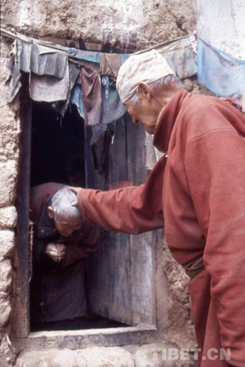 最后,我提出一個(gè)請(qǐng)求:希望能和老人家拍張合影。麥格隆說(shuō)可以,但是不要他坐著、我蹲在他旁邊的合影,他要站起來(lái)和我一起到洞外去拍。我看著他腳上潔凈的布鞋和白襪,外面地上全是泥濘,于是拼命擺手:“這里就可以,出去會(huì)弄臟了您的鞋子!”但是,老人家堅(jiān)持站起來(lái),換上一雙外出的厚底藏鞋,走出了修行洞。他心里對(duì)人的真誠(chéng)和尊重啊!從這個(gè)細(xì)節(jié)便能知曉。
