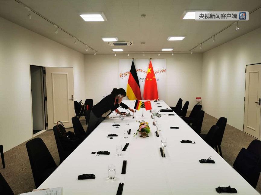 工作人員正在布置中德領(lǐng)導(dǎo)人會晤會場。(央視記者荊偉拍攝)