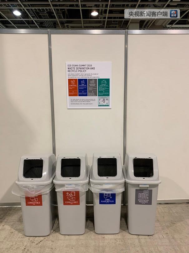 在G20新聞中心的垃圾桶。大阪將垃圾分為四類:可燃垃圾、易拉罐和玻璃瓶、報紙和雜志、塑料和塑料瓶。