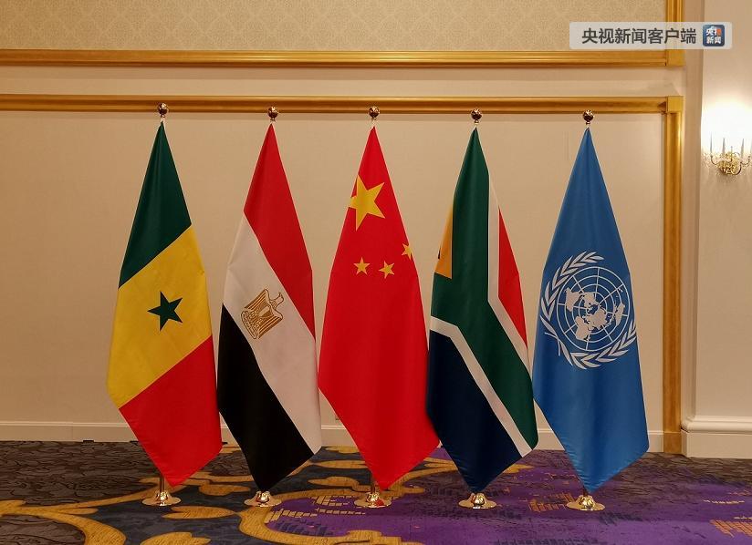現(xiàn)場擺放的中非領(lǐng)導(dǎo)人會晤五方旗幟。(央視記者楊立峰拍攝)