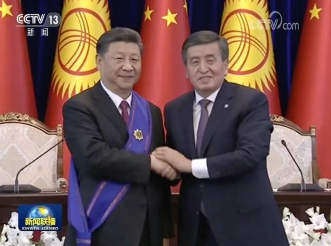 6月12日,習(xí)近平主席抵達(dá)吉爾吉斯斯坦首都比什凱克時(shí),吉總統(tǒng)熱恩別科夫親自前往機(jī)場(chǎng)迎接,并舉行隆重歡迎儀式。期間,習(xí)近平被授予吉爾吉斯斯坦國(guó)家最高獎(jiǎng)?wù)隆艾敿{斯”一級(jí)勛章。
