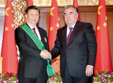 6月14日,習(xí)近平主席抵達(dá)塔吉克斯坦首都杜尚別時(shí),塔總統(tǒng)拉赫蒙也親自前往機(jī)場(chǎng)迎接。期間,習(xí)近平被授予塔吉克斯坦國(guó)家最高勛章“王冠勛章”。