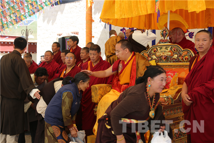 那曲市孝登寺由活佛洛桑尊珠?丹白嘉措始建,距今已近200年歷史。8月9日,十一世班禪前往孝登寺禮佛朝拜,抵達(dá)孝登寺后,珠康?土登克珠活佛向十一世班禪敬獻(xiàn)哈達(dá)。隨后,十一世班禪登上寶座帶領(lǐng)僧眾集體誦經(jīng)祈福,為寺廟僧眾和早早在此等候的信教群眾舉行長壽灌頂、摸頂賜福,為僧俗信眾發(fā)放長壽金剛結(jié)、長壽丸等。