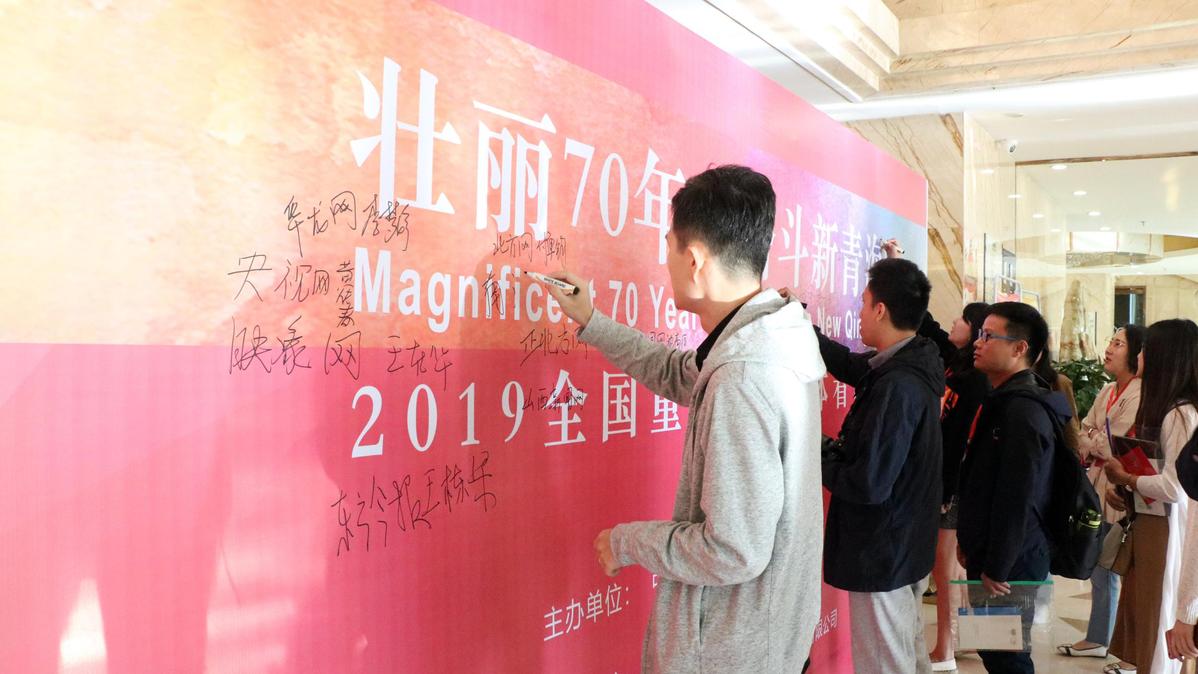 “壯麗70年 奮斗新青?!?019全國重點網(wǎng)絡媒體看青?!贝笮筒稍L活動正式啟動,媒體記者在簽到墻上簽名留念
