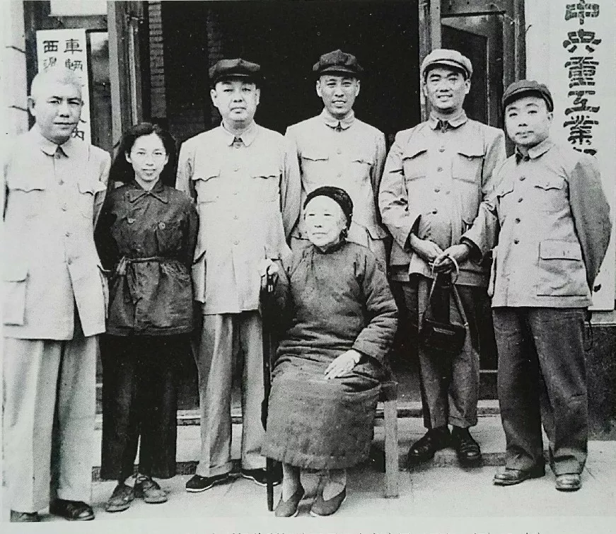 1951年4月,何香凝看望解放后第一批回國的印尼華僑回國工商業(yè)考察團(tuán)。中坐者為何香凝,后排站立左一為王源興、左三為黃潔、左四為家父李祝朝、左五為薛兩清、左六為施子卿。