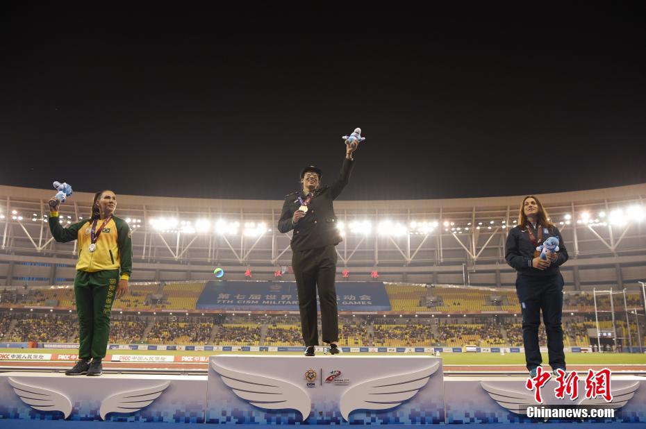 10月24日晚,第七屆世界軍人運(yùn)動(dòng)會(huì)女子鐵餅決賽在湖北省武漢市舉行,中國(guó)選手馮彬以64米83奪得冠軍。圖為馮彬在頒獎(jiǎng)儀式上。中新社記者 侯宇 攝