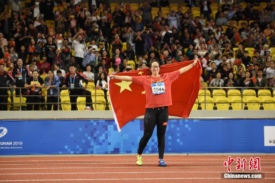 10月24日晚,第七屆世界軍人運(yùn)動(dòng)會(huì)女子鐵餅決賽在湖北省武漢市舉行,中國(guó)選手馮彬以64米83奪得冠軍。圖為馮彬慶祝奪冠。中新社記者 侯宇 攝