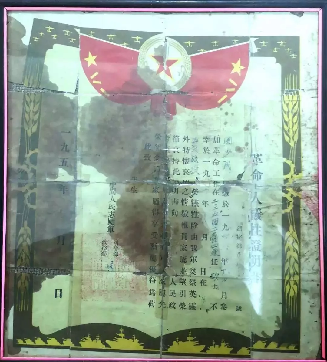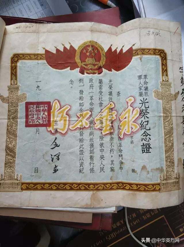 “革命軍人犧牲證明書”顯示: